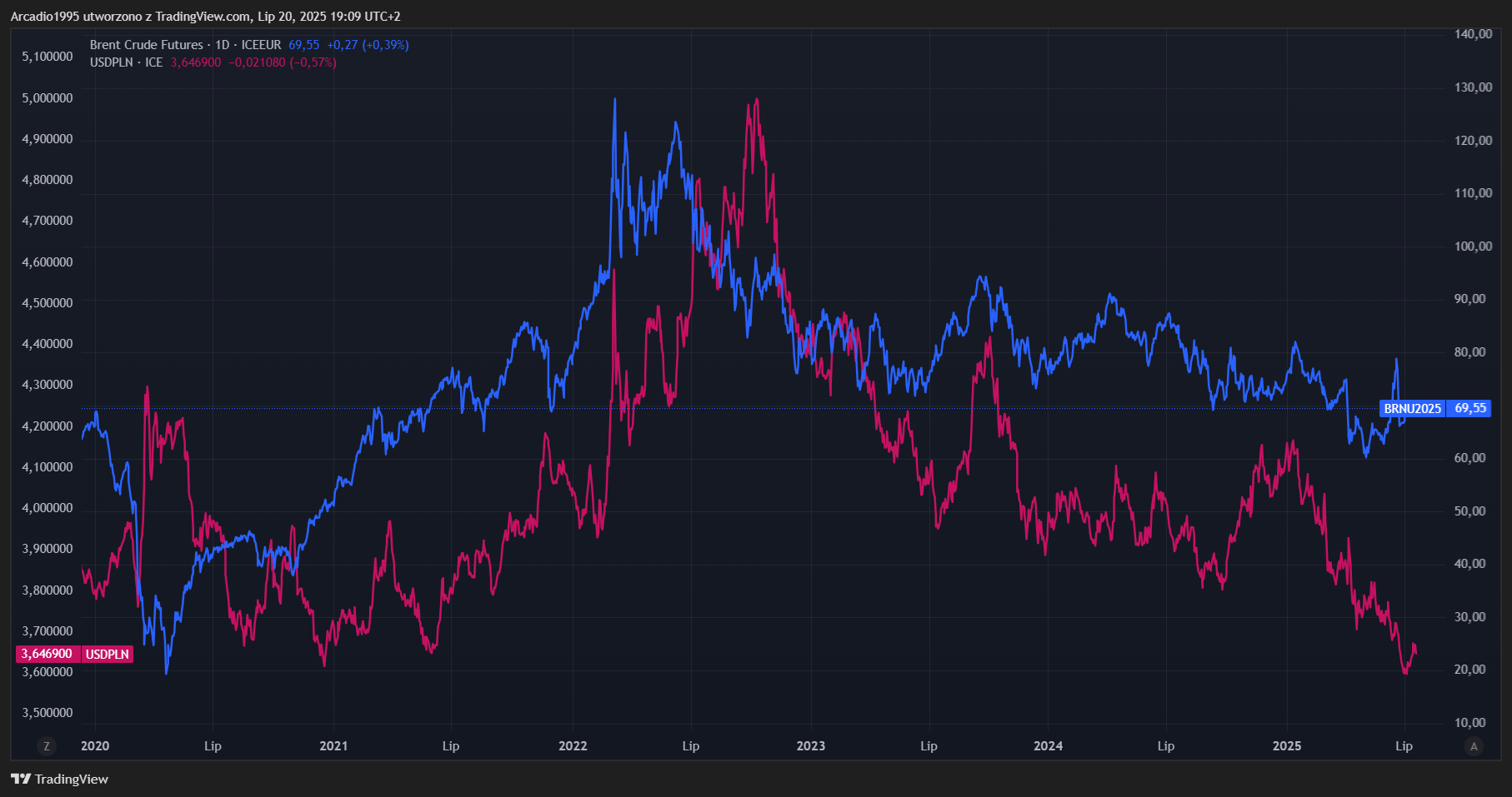 W tym momencie warto odwołać się do danych historycznych. Poniższy wykres przedstawia notowania ropy Brent (linia niebieska, prawa skala) oraz kurs dolara w przeliczeniu na złotówki (linia czerwona, lewa skala):