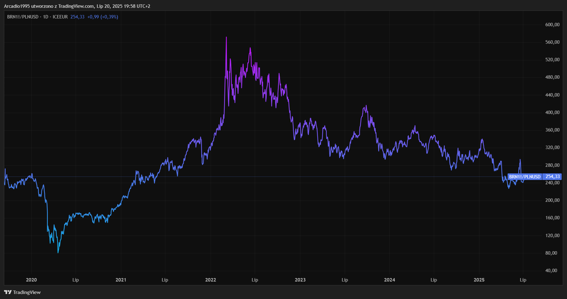 Po przeliczeniu kursu, notowania baryłki ropy kształtują się w sposób następujący: