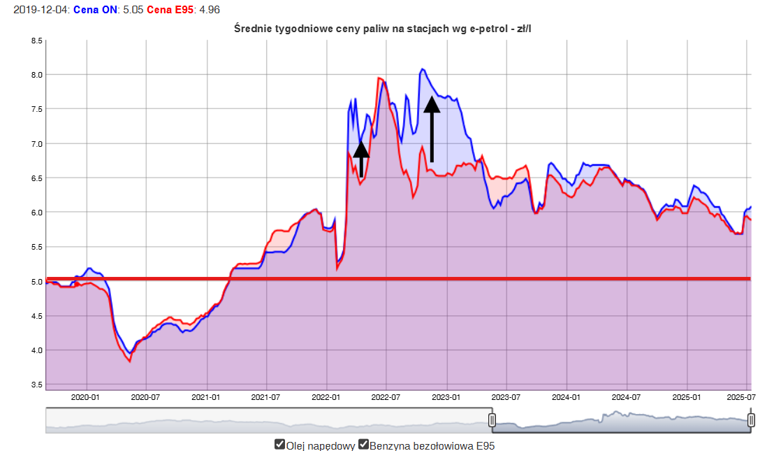 Po pierwsze, w momencie pisania tego artykułu, cena baryłki kształtuje się na poziomach bardzo podobnych do tych ze stycznia 2020 roku (czerwona linia na wykresie). W tamtym okresie, cena paliwa na stacjach wynosiła pomiędzy 5,00 a 5,20 PLN za litr. Obecnie, mimo iż baryłka kosztuje niemal tyle samo co wtedy, paliwo na stacji jest 20 – 30% droższe!