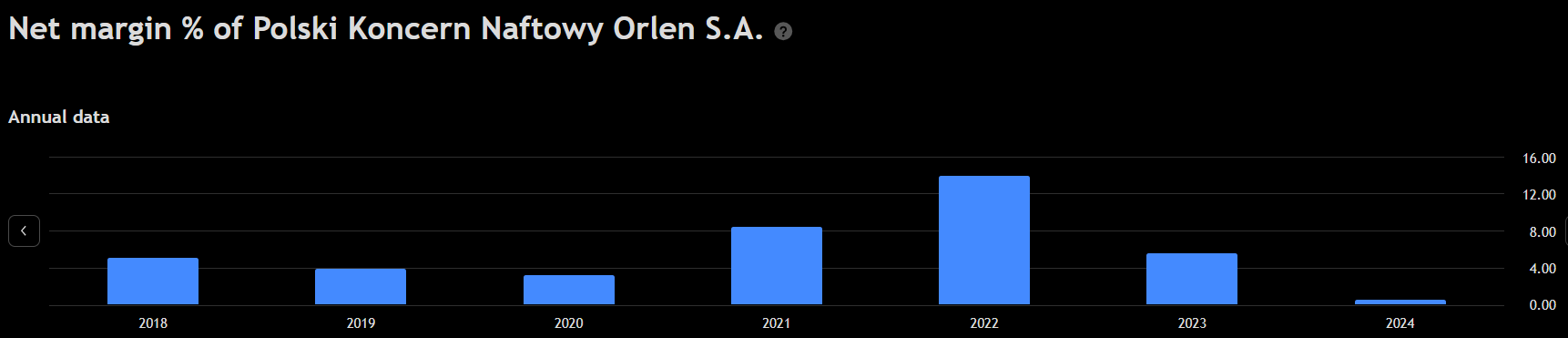 Nie do końca. Poniższy wykres prezentuje marże PKN Orlen za lata 2018 – 2024.